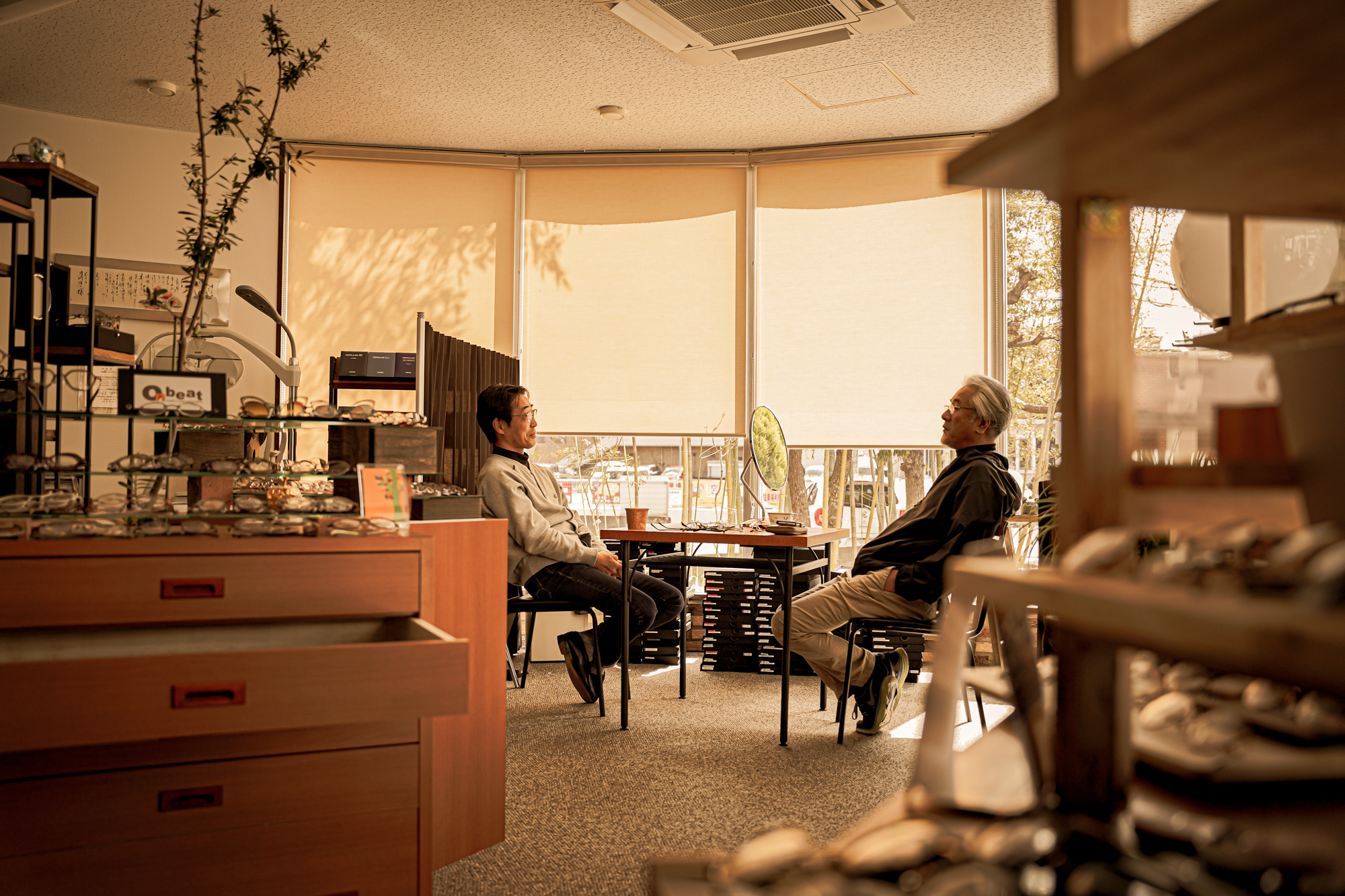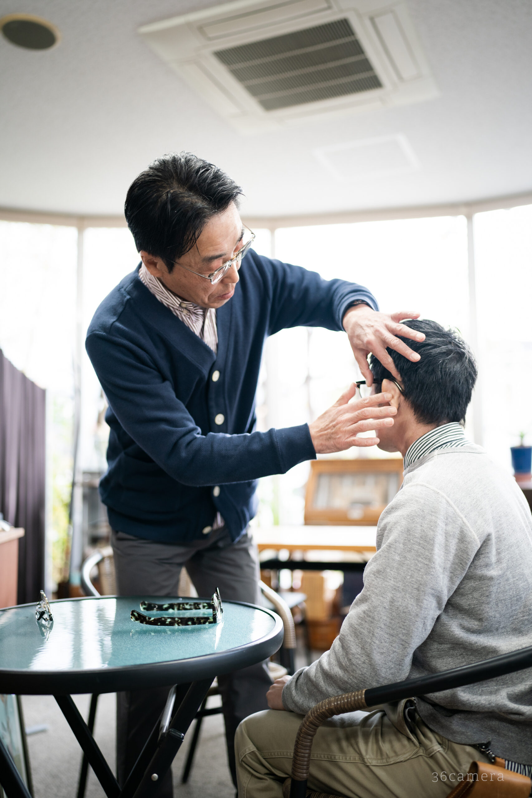 今回はお客さんに撮影のご協力をいただき、実際にオーナーの岡崎さんがお客さんの眼鏡の調整をされている様子を撮影しました。