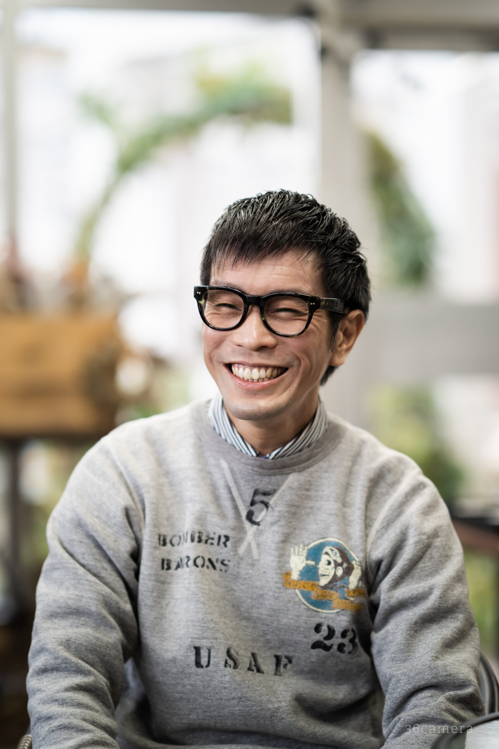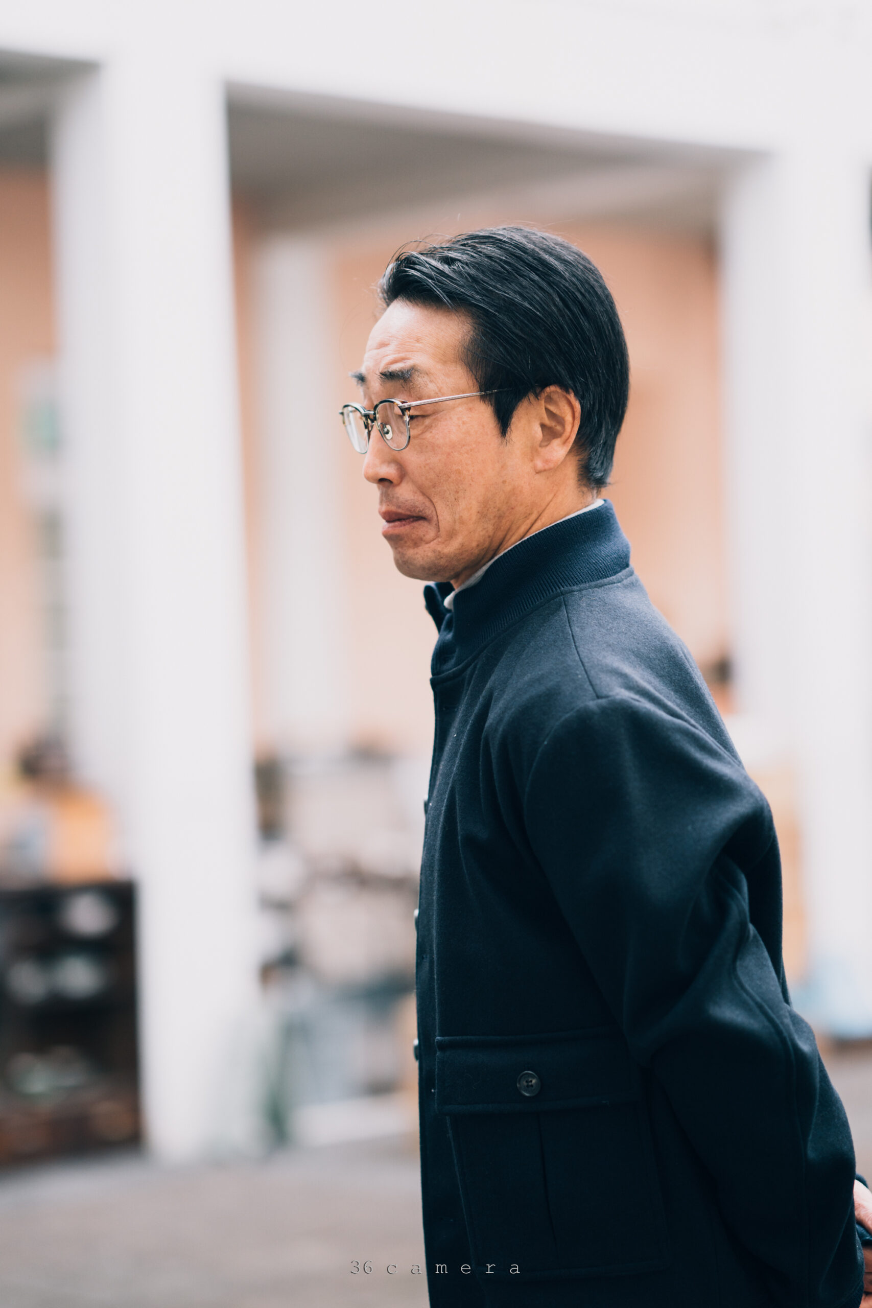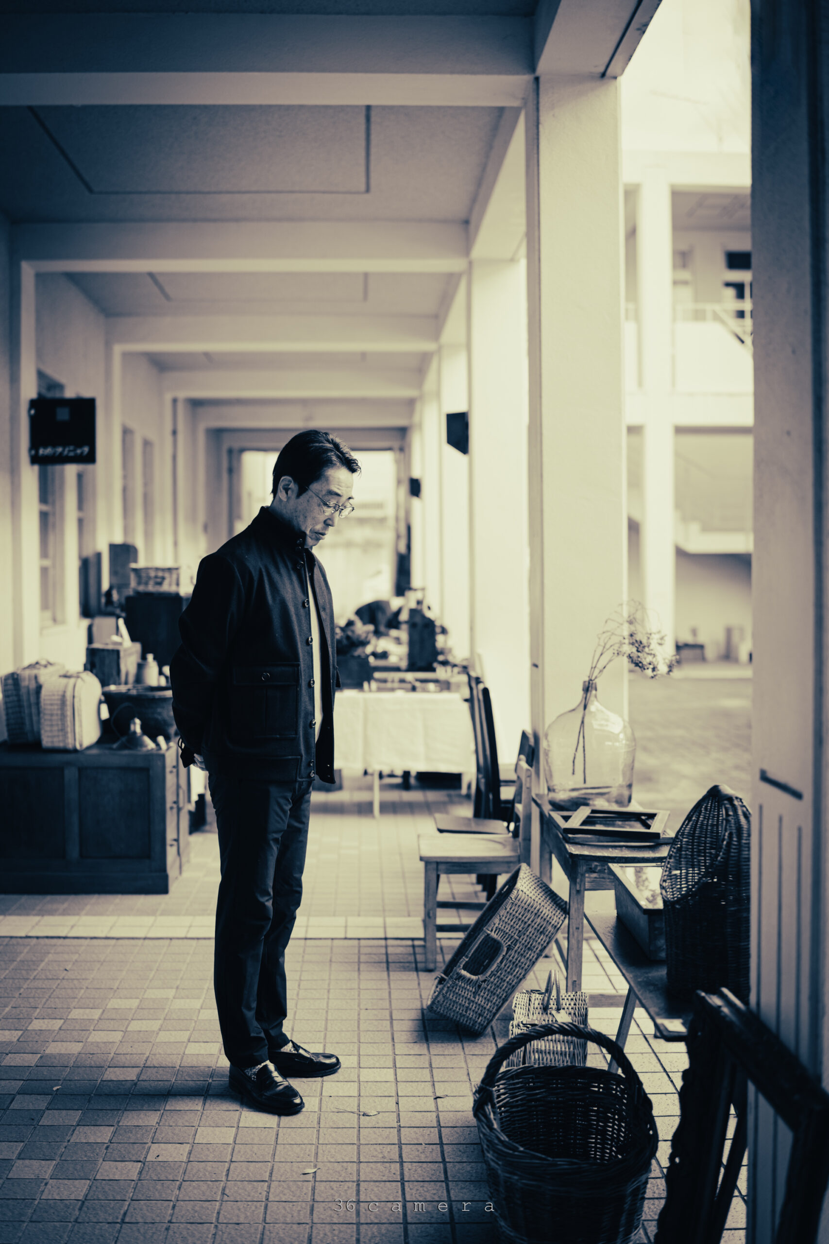 このときは、めがねステージおかざきさんのお店のある建物の中庭で、ふるもの市が開催されるとのことで、ふるもの市をロケーション撮影に使わせていただき、岡崎さんのポートレートを撮りました。