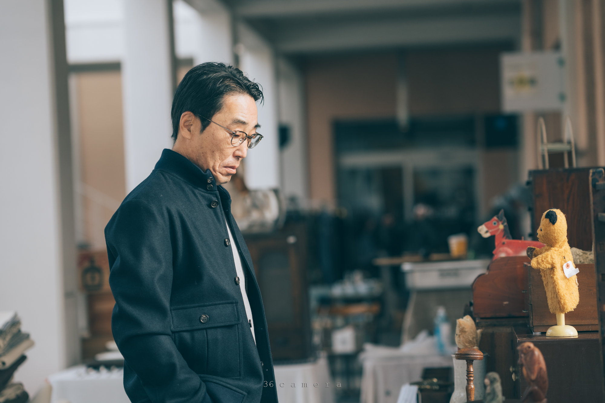 ロケーション撮影というよりも、岡崎さんがふるもの市を見物されている様子を望遠で、自然な雰囲気を狙いました。